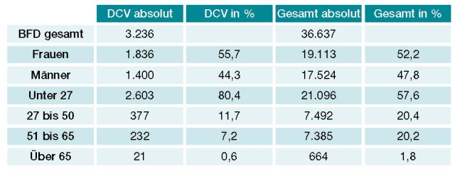Der BFD spricht alle Generationen gleichermaßen an - im Unterschied zum Freiwilligen Sozialen Jahr (FSJ), das für junge Menschen bis 26 Jahre vorgesehen ist. Es ist ein stetiger Anstieg bei der Zielgruppe der über 27-Jährigen zu beobachten, die inzwischen deutlich über 40 Prozent aller Bundesfreiwilligen ausmacht (Stand: August 2013, s. Tabelle links).
