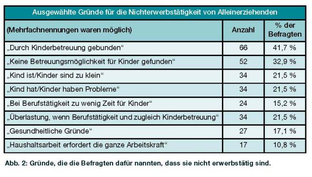 Die befragten Alleinerziehenden hatten einerseits zu einem sehr hohen Anteil ein modernes Familienbild, das die Vereinbarkeit von Familie und Beruf beinhaltet. Hinzu kam die Wichtigkeit, die einer Berufstätigkeit beigemessen wurde. Andererseits zeigt die Analyse der Gründe für die Nichterwerbstätigkeit, dass vor allem kinderbezogene Ursachen die Nichterwerbstätigkeit bestimmen.