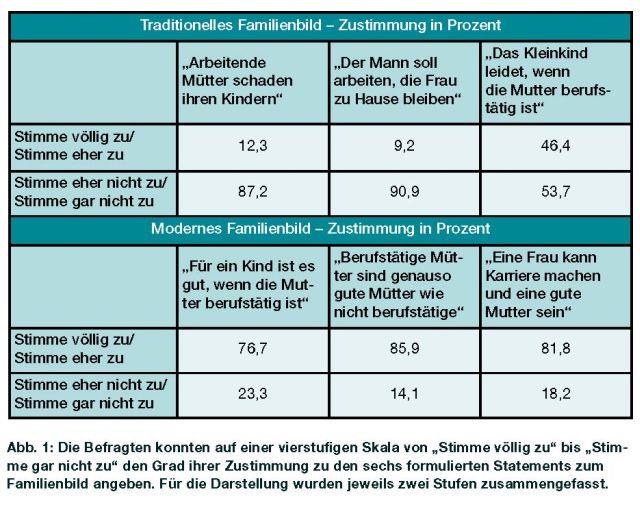 Die Antworten zeigen, dass die Alleinerziehenden sehr deutlich eine Berufstätigkeit mit Familie als vereinbar ansehen und somit ein modernes Familienbild haben. Mit 90,9 Prozent am stärksten fiel die Ablehnung bei der Aussage aus: "Der Mann soll arbeiten, die Frau zu Hause bleiben." 87,2 Prozent lehnten die Aussage ab: "Arbeitende Mütter schaden ihren Kindern." Die größte Zustimmung fand die Aussage: "Berufstätige Mütter sind genauso gute Mütter wie nicht berufstätige" (85,9 Prozent).