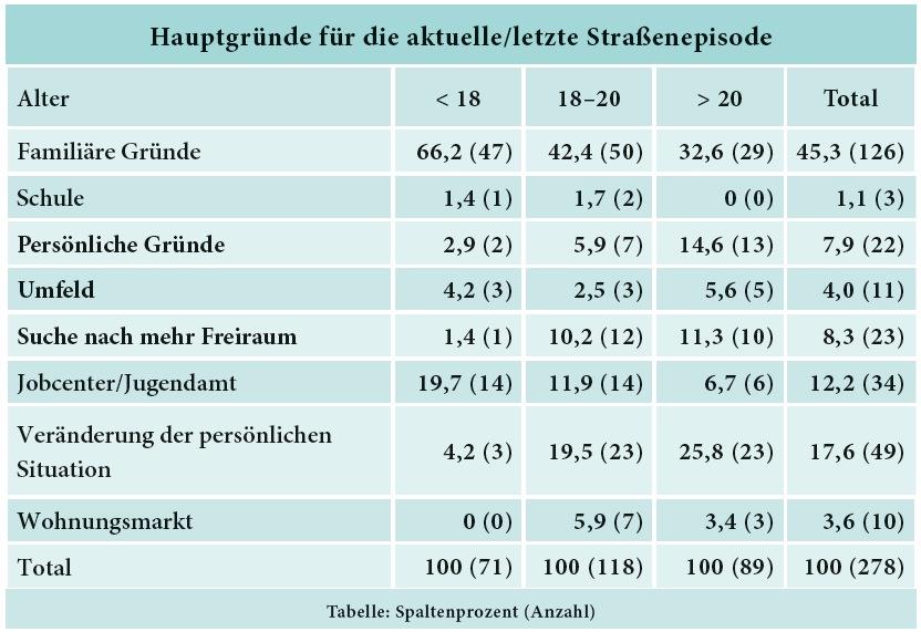 Die Befunde der durchgeführten Befragung machen einmal mehr deutlich: Die Herkunftsfamilie ist mit gut 45 Prozent ein Hauptauslöser für die Straßenkarrieren junger Menschen (siehe Tabelle rechts).