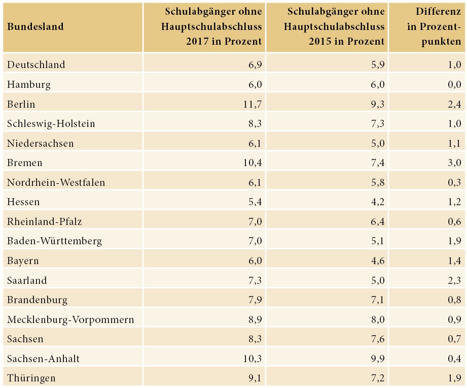 Nach einer technikbedingten Pause im letzten Jahr hat der Deutsche Caritasverband (DCV) dieses Jahr wieder seine Studie „Bildungschancen vor Ort" erstellt und die Quoten der Schulabgänger(innen) ohne Hauptschulabschluss bis hinunter auf die Kreisebene Deutschlandweit liegt die Quote für das Jahr 2017 bei 6,9 Prozent (52.000 Schulabgänger). Das ist ein Prozentpunkt mehr als 2015 und gleichauf mit 2009. Auch in den Bundesländern und in den meisten Kreisen und kreisfreien Städten sind die Quoten – unterschiedlich stark – gestiegen.