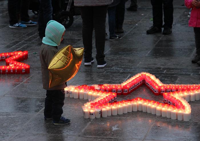 Caritas-Solidaritätsaktion „Eine Million Sterne“ lockte zahlreiche Passanten. Gemeinsamer Aufbau und Entzünden der Lichter. Unter den Teilnehmern der Veranstaltung auch zahlreiche Flüchtlinge