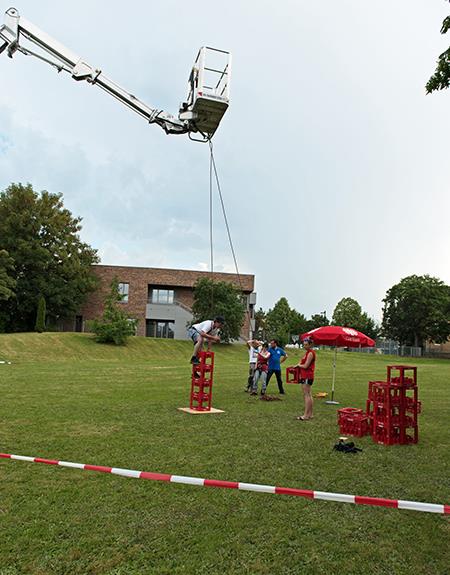 Als Stationen im Parcours in der St.-Vinzenz-Straße konnten sich die Festgäste im Zelt der Sportjugend zum Beispiel im Standweitsprung erproben. Highlight war allerdings das angebotene "Kistenstapeln": Mit Hilfe eines Kranes ging es dabei auf gestapelten Getränkekisten hoch hinaus. Ganz im Sinne guter Nachbarschaft waren die Angebote übergreifend bis zum Soccerfeld der Antonius gGmbH verteilt.